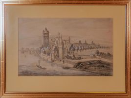 Frankfurt/M. 1839 – 1883 daselbst, „Ulrichstein/Sachsenhausen“, verso betitelt, Tuschzeichnung, weiß gehöht, 22 x 36 cm (PP-A.), Lichtschaden, fleckig (41486-16)