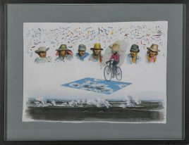 „Vier geniale Nomaden“, betitelt, Collage über Offset mit Prägedruck in Hebräisch, E.A., 30,5 x 49 cm (41069-207)
