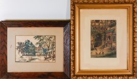 Wiesbaden 1852 – 1910 Frankfurt/M.,“Gerbermühle“, verso betitelt, Aquarell und Tusche, 14,5 x 21,5 cm (PP-A.), fleckig, gebräunt; r.u.sig., „Hinterhofszene mit Hühnern“, Aquarell, 20 x 14 cm (PP-A.), Lichtschaden (2) (41486-13)