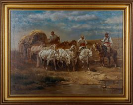 „Pferdefuhrwerk mit arabischen Reitern am Flussufer“, Öl/Lwd., 45,5 x 60,5 cm (41494-63)