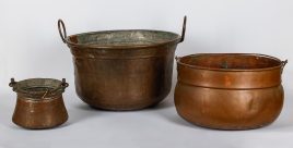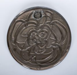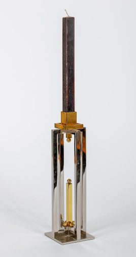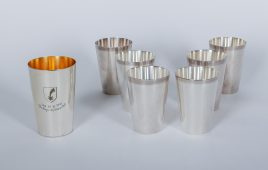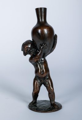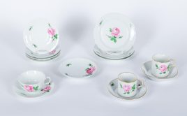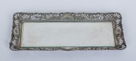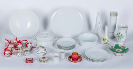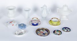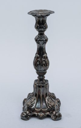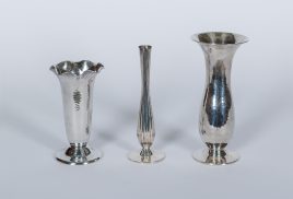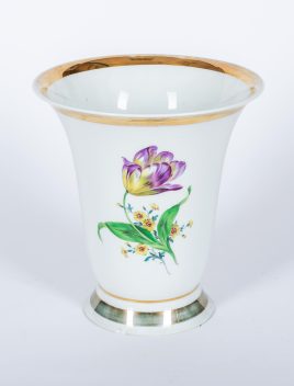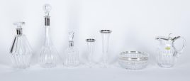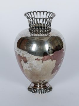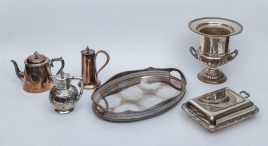 florales Dekor, H = 16 cm, dazu Flaschenkühler, Dose und zwei Tafelleuchter, D = 14 cm, H = 6 cm und 13 cm, je Metall (41394-6)