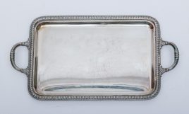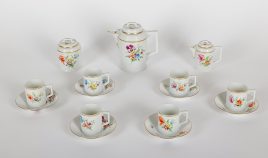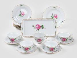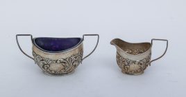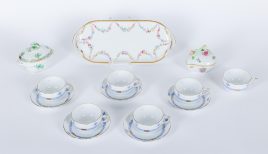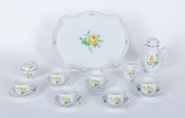 Kaffee- und Teekanne, Zuckerschale, Sahnegießer, Dose, zwei Henkelschalen, Tablett und verschiedene Besteckteile, teils mit Monogramm, Druckstellen, Gebrauchsspuren (41587-26)