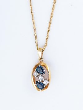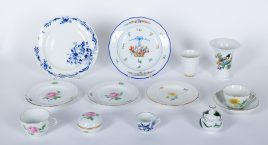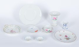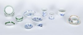 Anhänger, 750 GG, mit einer Porzellan-Platte, Meissen, brutto ca. 14,2 g, dazu Anhänger, vergoldet, mit einem geschliffenen Achat und Quartz, H = 4,5 cm, berieben, dazu Collierkette mit Anhänger, 925 Silber, mit einer Porzellan-Plakette, Meissen, brutto ca. 7,5 g, Gebrauchsspuren (41563-50)