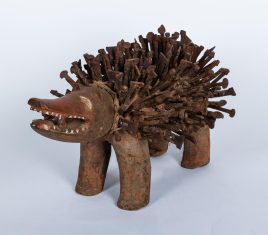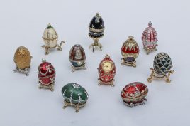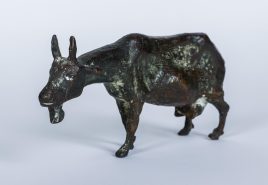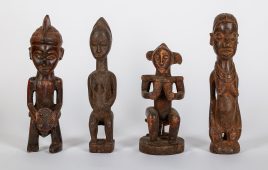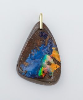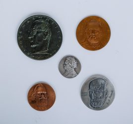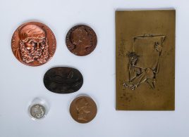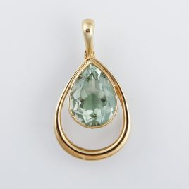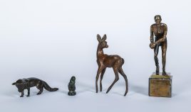 „Fisch“, teils ornamentiert, besetzt mit einem grünen Dekorstein-Cabochon, D = ca. 3,8 mm, ca. 2,5 g, Gebrauchsspuren, eine leere Fassung; Anhänger, Metall vergoldet, „Afrika“, ornamentiert; Anhänger, Silber vergoldet, „Schuh“, filigran, ca. 1,9 g; Anhänger, Metall vergoldet, „Schuh“, besetzt mit einem rund-facettierten farblosen Dekorstein /zus. 95, 96, 97, 100 (41504-95)
