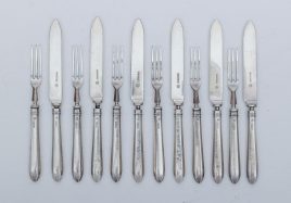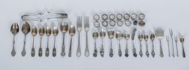 sieben Vorspeisenmesser, sechs -gabeln und sechs -löffel, je vier Fischmesser und -gabeln, drei Menümesser, drei -gabeln und sechs -löffel, sechs Kaffeelöffel, vier Kuchengabeln und acht Teile Vorlegebesteck; Vorleger und zehn Kaffeelöffel, versilbert; zwei Kaffeelöffel, 800 Silber, Monogrammgravur und dat. (19)26, ca. 26 g, dazu ein Nussknacker (41530-1)
