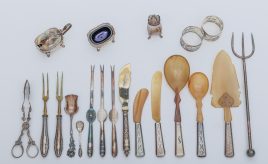 darunter Besteckteile, teils WMF, Perlmutt-Eierlöffel, verschiedene Vorleger, zwei Gewürzstreuer, Serviertenring, zwei verschiedene Schalen, sowie Zuckerzange, Silber, ca. 26 g, beschädigt /aus 19 (41610-53)