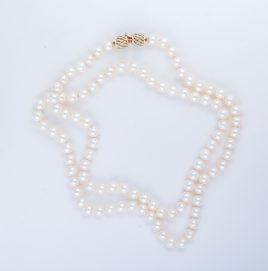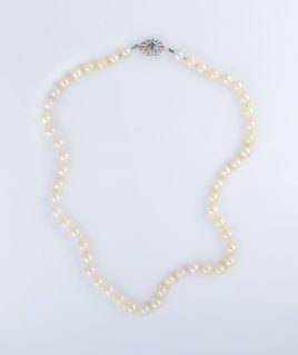 aus 55 Perlen, D = ca. 6,5 – 6,8 mm, Schließe in 585 WG und GG, ornamentiert, besetzt mit einer Zuchtperle, D = ca. 3,2 mm, L = 40 cm, Fädelung lose (41553-8)
