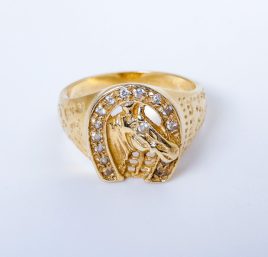ein einzelner Ohrhänger; eine einzelner Creole; Nazar-Anhänger mit farbigem Dekorstein (verbogen); Ring, besetzt mit vier Brillanten von zus. ca. 0,04 ct. (drei leere Fassungen) und ein einzelner Rückstecker, ca. 11,2 g, sowie Witwenring, 333 GG, ca. 4,1 g (41450-21)