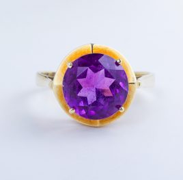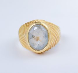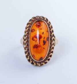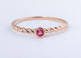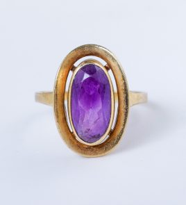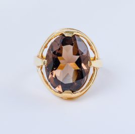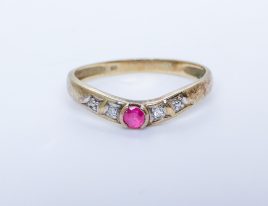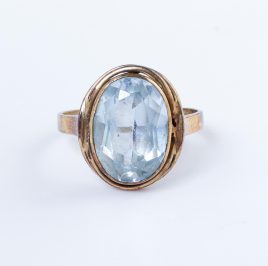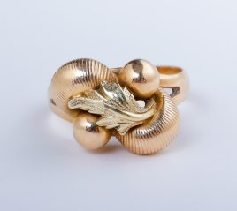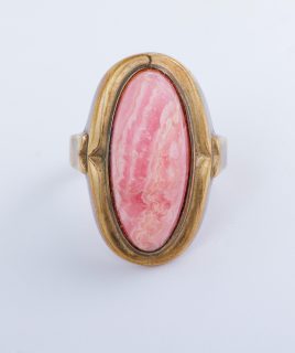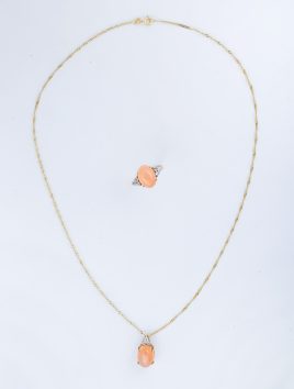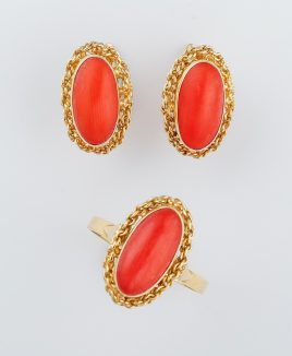 blütenförmig, mit einer geschnittenen Korall-Rose, RW 56, ca. 1,4 g, dazu Ring, 333 GG, besetzt mit einem rund-facettierten roséfarbenen Farbstein, D = ca. 4,3 mm, RW 57, ca. 1,0 g, Ringschiene restauriert, Farbstein berieben (41571-77)
