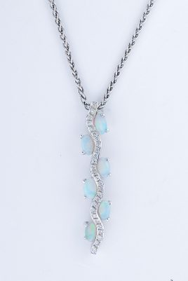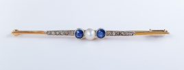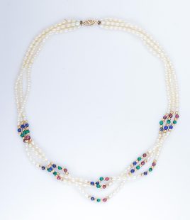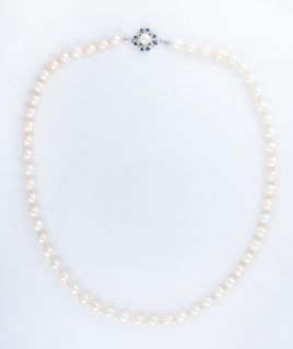 D = ca. 3,4 – 3,7 mm, Kugelschließe in 585 WG, besetzt mit fünf rund-facettierten Saphiren von zus. ca. 0,05 ct., L = 44 cm, Perlen teils berieben (41571-45)