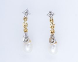 besetzt mit je einer Zuchtperle, D = ca. 4,5 mm, und insg. vier Diamanten im 8/8-Schliff von zus. ca. 0,04 ct., dazu zwei Ohrhänger, 333 GG, unvollständig, ca. 3,1 g (41451-6)