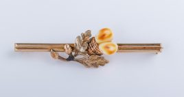 geometrisch durchbrochene Form, ca. 0,9 g, dazu Nadel, 8 und 14 K GG und Roségold, blütenförmig besetzt mit einer Saatperle, D = ca. 1,6 mm, umgeben von neun facettierten Granaten, ca. 1,2 g, restauriert, Gebrauchsspuren, dazu Nadel, Metall vergoldet, mit einem schwarzen Dekorstein, einer Dekorperle und einem ovalen Opal (ca. 3,1 x 2,3 x 1,1 mm), restauriert (41466-12)