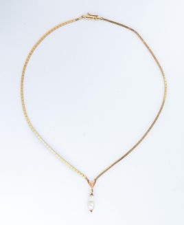 Brosche (im Original-Etui) und zwei Collierketten mit Anhängern (eine unvollständig und beschädigt), Metall vergoldet, besetzt mit Zuchtperlimitationen, L = 48 und 42 cm, Gebrauchsspuren (41435-3)