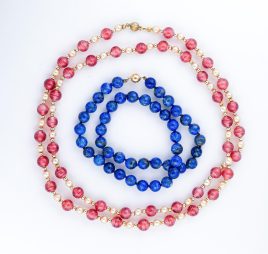 Schließe in 750 GG, L = 50 cm, berieben, dazu Zuchtperlcollier, D = ca. 6,5 mm, L = 40 cm, Kugelschließe in 925 Silber, abgetragen, dazu Rosenquarz-Collier, D = ca. 4,3 – 8,2 mm, zwischengefasst barocke Süßwasserzuchtperlen und vergoldete Kugeln, L = 72 cm, Gebrauchsspuren (41569-9)
