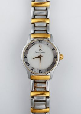 Uhr und Original-Ansatzband in Stahl, teils vergoldet, Quartz, Perlmuttdekor, Zifferblatt besetzt mit elf rund-facettierten farblosen Dekorsteinen, Datum bei „6“, Zentralsekunde, Gebrauchsspuren, nicht gangbar (41402-30)