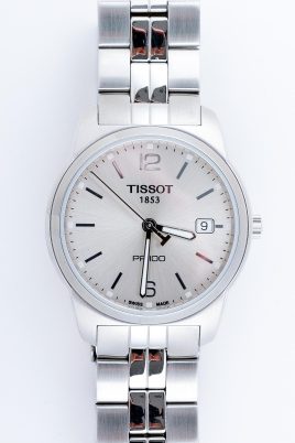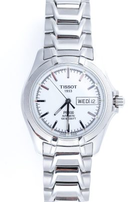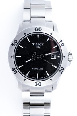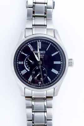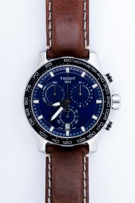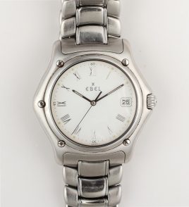 Uhr und Original-Stiftschließe in Stahl, Quartz, Datum bei „3“, Sekunde bei „6“, Stoppfunktion, schwarzes Original-Lederband, nicht gangbar (41410-8)