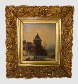 ‚Eisvergnügen vor einer Burg‘, Öl/Lwd., 22,5 x 19,5 cm, Farbfehlstellen (Fi)