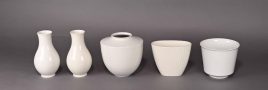 weiß, Goldrand, H = 16 cm; zwei Sherrygläser, facettiertes Klarglas, florales Dekor, H = 11,5 cm; zwei Paperweights und zwei Gipsreliefs, ‚Musen‘, H = je 10 cm
